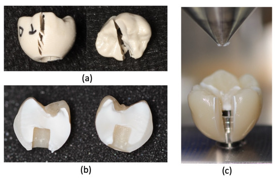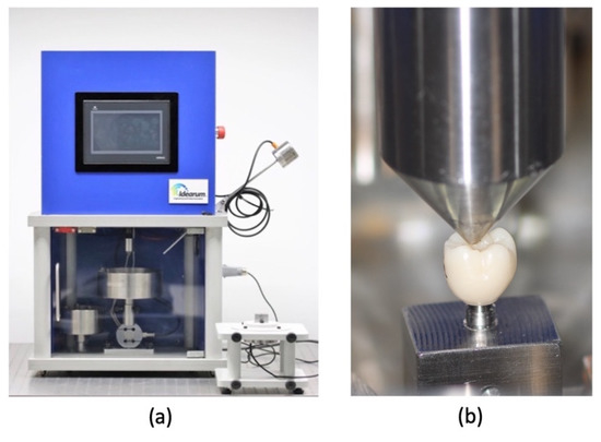 - The resistance of the crowns was tested using a CS® Dental Testing Machine (Barcelona, Spain), as shown in Figure 3a. The CS® Dental Testing Machine is a fatigue testing device built in accordance with 2006/42/EC machine safety and EN 12100-1/2, EN 954-1, EN 1037, EN 61310-1/2, EN 60204-1, EN ISO 14121-1, and EN ISO 13850 standards.