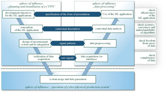 The solution approach consists of merging various methods—previously largely applied separately—with which the quality of the data can be planned, controlled, and produced into a holistic methodology. The approach to quality assurance for ML applications presented in the following, especially in cyberphysical production systems, is based on the V-model of software development [48] and the V-model for mechatronic systems [49]. The approach is holistic. This means that all areas of influence on data quality and consequently on analysis quality are included. This means that the entire chain of data processing must be taken into account. The chain of data processing begins with data generation and the creation of the analysis-capable database continues through the gain of knowledge using applied analysis algorithms. Finally, it extends to the decision or the initiation of the actions that are justified from the analysis results—at first glance, this tends to address software issues. But in actual when it comes to the question of generating the data that must be suitable for answering the analysis task and transferring it to the database in a robust and performant manner, it becomes clear that hardware development plays an equally important role. Under the focus of CPPS, hardware development includes the design of the system from actuators, sensors to mechanical components, from transmission elements and interfaces in IT to humans. One crucial thing for the quality of the data is the “data-fair design” of the CPPS. Data-fair design means that during the system development the later data workflow must be thought of already, which is usually possible only after the commissioning of the CPPS with the data won from it. For this reason, the viewpoint of the DMME [33,34] was included in the concept presented here and integrated into the contents of the individual workflows.