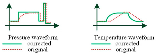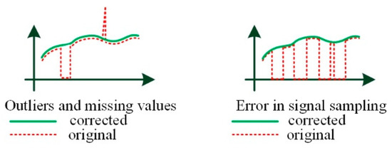 In this task, the actual contextual data analysis of the data takes place to solve the ML task. Ideally, the data should be complete and free of errors as a result of the previous steps. During the data analysis, the data is prepared for further analysis. For example, the data is formatted as required by the analysis software without changing the meaning of the data. During data exploration, new data sets are also often transformed or constructed from the primary data. For example, ratios to the data sets such as averages, derivatives, etc., are calculated to be able to visualize the physical behavior of the CPPS with appropriate models. Effects such as dead time or compensation behavior of the underlying processes also must be taken into account or used to restore data quality. Thus, the dynamic process properties provide decisive information regarding the data quality. Figure 5 shows data quality problems that can only be identified and corrected in context.