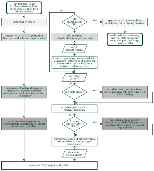 The proposed concept for holistic data quality assurance has been applied and tested in several research projects, such as: “Smart Data Services for Production Systems”, “PREMAMISCH—Predictive-Maintenance-Systems for Mixing Plants” and “GIgAfLoPs—Holistic Machine Learning in Production”. In the GIgAfLoPs, the application of industrial ML algorithms was thus secured. The flow chart shown in Figure 6 illustrates the application of A Holistic Quality Assurance Approach on the example of Tool Condition Monitoring. For more details about this example see [51].