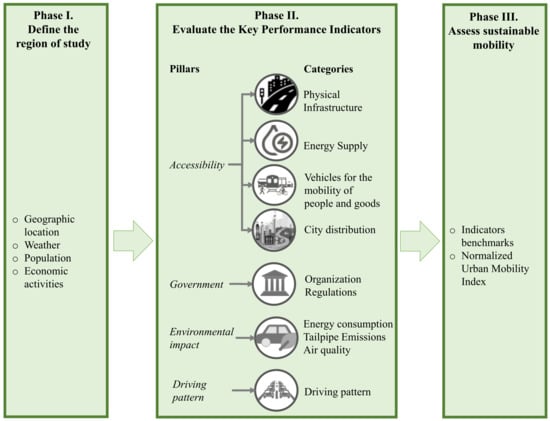 Illustration of the phases to be followed in the proposed methodology to assess sustainable urban mobility.
