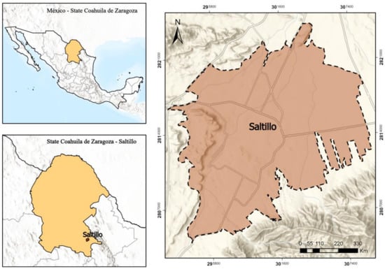 - Redes Urbanas y Servicios de Planeación, S.A. de C.V. Programa de Desarrollo Urbano de la Zona Metropolitana de Saltillo-Ramos Arizpe-Arteaga. Saltillo. 2012. Available online: http://www.segucoahuila.gob.mx/admin/uploads/Documentos/modulo23/programa_de_desarrollo_urbano_de_la_zona_metropolitana_saltillo_ramos_arteaga.pdf (accessed on 9 August 2021).