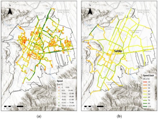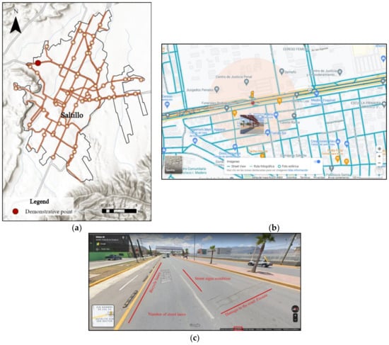 Following the methodology based on Web Map Services stated in Section 2.2.1, a diagnosis of the mobility infrastructure of Saltillo was performed. The cartographic representation was obtained from the National Institute of Statistics and Geography []. It contains data from roads in Mexico. These data are then shaped into a GIS software (ArcMap) which consists of projecting and purifying all the road data contained. Then, a random geospatial sampling was carried out with the WMS software (Google Maps–Street View add-on). Fifty locations randomly distributed along the city′s road network were considered to diagnose the roads. Data shown in WMS are based on public measurements between July 2009 and September 2019. Figure 3 shows an illustration of the steps followed on a single randomly selected location.