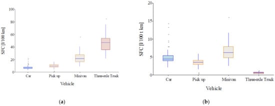 To determine the vehicle SFC, the average values reported by vehicle manufacturers of the circulating vehicles (per each model and model year) may be considered. However, it is of major interest their real-world energy consumption. The latter approach allows the inclusion of the effect of local conditions such as age deterioration, mechanical condition, driving patterns, among others. Common strategies to measure real-world fuel consumption on a representative sample of vehicles are: (i) measuring the fuel’s weight before and after a specific distance driven (gravimetric method), (ii) measuring instantaneous fuel consumption through the On-Board Diagnostic system (OBD method), and (iii) surveying the SFC reported by the vehicles in their dashboard. We recommend the second alternative, which nowadays can be obtained through third companies that provide this service using telematic systems. A detailed description of the measurement of fuel/energy consumption can be found in [,,].