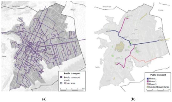 Urban areas are wide regions with complex issues related to individual, collective, and freight mobility. The continuous urban growth around the globe in the last few decades has provoked widespread urban growth with alarming rates of growth rates in the vehicle fleet and their environmental impact []. The use of vehicles becomes a problem when meeting air quality standards in urban areas since polluting emissions increase significantly in such places with the number of vehicles and traffic []. Consequently, the mobility concept has changed to a sustainable urban mobility concept. Mobility is the ability to move freely. In the context of urban regions, sustainable mobility is the ability of a transport system to meet the needs of its citizens and goods of gaining access to desired locations, with the minimum environmental impact, minimum cost, and means well accepted by the community. This means that mobility is no longer based on the distances and attraction nodes classical model []. Now, it is the ability to meet the needs of society to move freely, gain extensive access to desired locations, communicate, negotiate, and make relationships without sacrificing other values, today or in the future [].