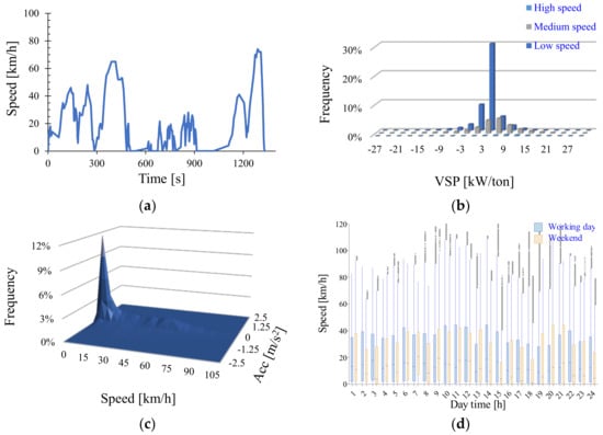 For the evaluation of the driving patterns that drivers follow in the region of interest, several authors use a set of Characteristic Parameters (CPs) []. They are metrics based on the speed versus time profiles that drivers follow, such as average speed, average positive acceleration, idling percentage, and any other derivation from them. Some other authors use speed versus time profiles (driving cycles) to describe driving patterns. The representative driving cycle can be obtained by instrumenting a large sample of vehicles to obtain at 1 Hz information about the fuel consumption, speed, and geo-localization, simultaneously. Then, the collected database of sampled trips is used to construct the representative driving cycle by the micro-trips, Markov, or trip-based method. Quirama et al. [] describe in detail the methods of obtaining representative driving cycles. In addition, the frequency distribution of VSP (vehicle specific power) and the frequency distribution of speed and acceleration can be used for describing the driving the local pattern.