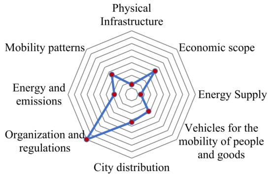 The accelerated expansion of urbanization has had consequences associated with infrastructure, air quality, and the quality of life of residents. Unfortunately, this process leads to a vicious circle in which the expansion of infrastructure stimulates urban growth towards the periphery, increasing car dependency, which in turn requires additional infrastructure development to ease accessibility []. Therefore, at this stage of the proposed methodology, an assessment of infrastructure available in the city for the people to access the different places of the city should be performed. Four major areas have been considered: physical infrastructure, energy supply, vehicles for the mobility of people and goods, and city distribution.