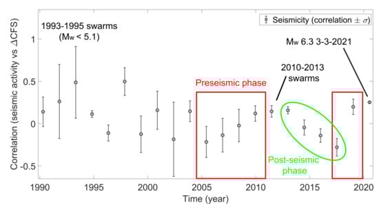 Northern Thessaly Region was recently hit by the Larissa seismic sequence (mainshock 3 March 2021, M 6.3, 11.5 km depth, USGS), causing widespread damage and one casualty. The still ongoing seismicity occurred along normal faulting. The analysis of correlation between the CFS and the nucleated seismic energy is performed between 1990 and 1 May 2021 in an area within latitude 39.5–40.2° N and longitude 21.7–22.4° E considering only earthquakes with M > 2.0. After an initial period featured by elevated correlation values corresponding to a seismic swarm (M≤ 5.0, 0.45) which occurred between 1993 and 1995, a decennial decrease of correlation followed. The trend switched in 2005–2007 and continued till the correlation turns positive. The progressive increase stopped in 2010 when diffuse swarms were recorded.