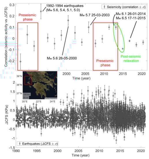 (Top) correlation between CFS and seismicity close to the Greek Ionian coasts (38.0–39.0° N, 20.0–21.0° E, M > 2.0, NOAIG Catalog.) between 1990 and 2021. Main event was located in southwestern region of Lefkada Island between the villages Athani and Agios Petros. The 2014–2016 seismic sequence involved faults within different tectonic settings. (Bottom) CFS as a function of time. Before the 2014–2016 seismic sequence, significant changes in the Coulomb stress distribution was observed, partially due to contribution of deeper (>20 km) earthquakes.