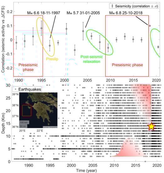 Correlation between CFS and seismicity close to the Greek Ionian coasts (37.0–38.0° N, 20.0–21.0° E) between 1985 and 2021. A nine-years-long preseismic phase is highlighted both by an increasing value of correlation in the upper part of the picture, and seismic quiescence, represented by two red shadow zones, at a depth of 0–10 km (2012–2017) and >20 km (2015–2018). The yellow star represents the M 6.8, 25 October 2018 Lithakia mainshock.