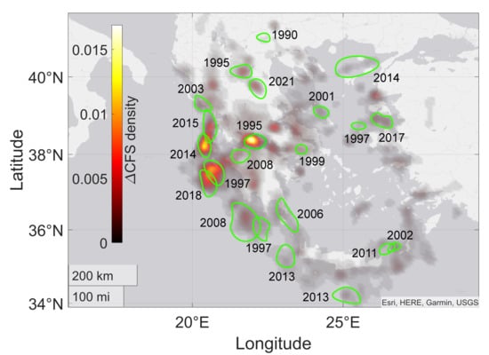 The brightest patches are located where the 2014–2015 Ionian and the 2018 Lithakia seismic sequences occurred. This means that seismic activity in the Aegean region is usually self-triggered at large spatial scales. Compare with Figure 4 and Figure 5.