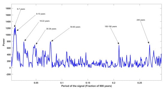 Beyond the aforementioned issues, well-established scientific evidence exists about tidal synchronization in seismic catalogs, as already discussed in the introduction. Both global and regional seismic series show semiannual, annual, biennial, with approximately 9-, 19-, 37-, and 56-years-long periods activity modulations. While the first three frequencies are generally associated with seasonal patterns, the others have no explanation other than lunisolar tidal loading. The FFT of European magnitudes (SHEEC 2020 catalogue) in Figure 6 clearly attests this phenomenon. Since M≈ 6 for the SHEEC catalogue, the nonuniform FFT is applied to include at least M > 5.0. Instrumental recordings are rarely available before the 1950s also for violent earthquakes, and therefore, macroseismic intensity data are widely used combined with epicentral macroseismic intensities and other parametric data sources. Therefore, parametric catalogs must be used with caution and results must be interpreted according to their reliability. Even if an accurate analysis cannot be performed for the aforementioned reasons, the power spectrum of the European seismicity shows typical tidal frequencies such as 8–10- or 18–19-years-long periodicities and some multiples. Moreover, local seismic rates are noticed to be directly correlated with the phase of tidal shear stress or the Coulomb failure stress change in submarine volcanic seismicity [] and seismic tremors []. Finally, it is reasonable to expect that the triggering power of tides is affected by the following variables: