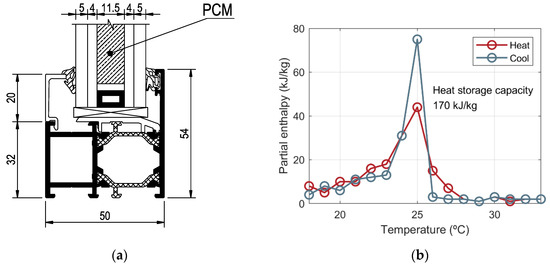 - The glazed façade of the PCM room was double-glazed with a cavity filled with PCM. This window was 5 + 4 mm laminated glass, 11.5 mm PCM and 4 + 5 mm laminated glass. Table 1 shows the thermophysical properties of the glazed façade (heat transfer coefficient U-value, visible transmittance Tvis and solar transmittance Tsol) calculated using WINDOW 8.0 [28] and, the experimental data of Goia [29], that used the same paraffin wax and the window properties as our experiment. Figure 2a shows the cross-section of the PCM window, and Figure 2b shows the partial enthalpy of the PCM paraffin according to the manufacturer datasheet [30]. A total of 20.8 kg of paraffin wax was used.