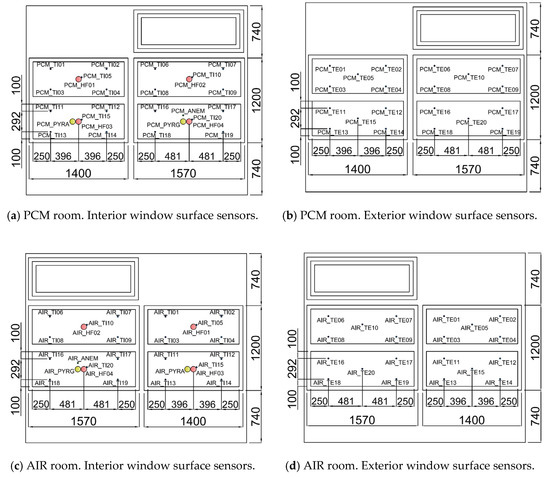 Sensor’s position. Dimensions in mm. TI and TE refer to thermocouples in the interior and exterior surface of the window, respectively. HF refers to heat flux sensors. ANEM refers to the anemometer. PYR and PYRA refer to the pyrgeometer and pyranometer, respectively.