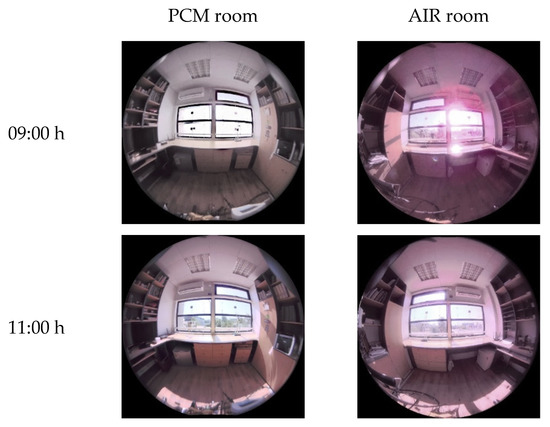 Table 5 shows the sensors used to measure the HVAC power, thermal comfort, visual comfort, and thermal performance of the window. Thermal and visual comfort sensors were centered 1.5 m from the window at a height of 1.15 m to reflect a seated person’s eye (Figure 1). Current/voltage sensors Multivoies (Multichannel energy consumption Data Logging) produced by the OmégaWatt Company, France, were used to measure HVAC power. A SensoData 5500 MK (Sensor Electronic, Poland) was installed in each room to measure thermal comfort, the SensoData was composed of a standard datalogger SensoData 5500 and a set of sensors, SensoTCMod 5507. To evaluate visual comfort, the Complementary Metal Oxide Semiconductor (CMOS) Sensor Sony IMX219 was used to measure the luminance distribution, as reported by [31,32]. They determined that the luminance range varies from 3 to 18,000 cd/m2 with an average accuracy of 3.0% to 17.5%, which is appropriate for interior luminance measurements. Figure 3 shows the locations of the rest of the sensors installed on the window of each room. Figure 4 shows fisheye pictures of both offices at 9:00 and 11:00 h. In the case of the PCM room, Figure 4 shows the PCM in the solid state a 9:00 h, and it is in the liquid state at 11:00 h. Figure 5 also shows general pictures of the experimental setup and the installed sensors.