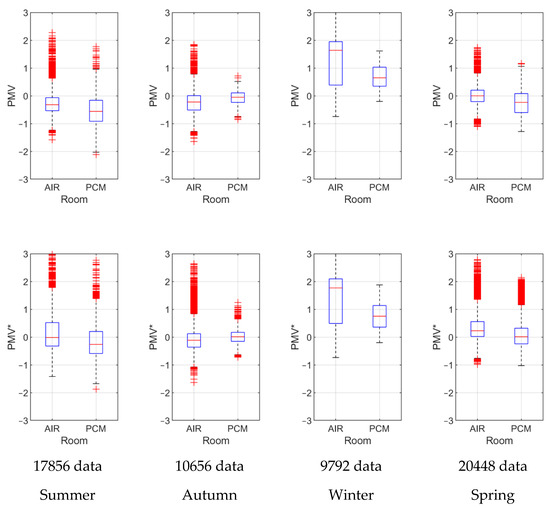 For partly cloudy and sunny days in mid-season cold, the PCM glazing impact on thermal comfort was the same as in the summer season, where the PCM phase change occurred in the morning and helped to reduce the mean radiant temperature. Despite this, the low thermal inertia of the reference window caused PMV and PMV* to be close to −1.0 in the AIR room during the afternoon, which implies cold thermal sensation (Figure 11f,g). On the other hand, PMV showed no difference between the two rooms on cloudy days because PMV mainly depended on air temperature under this condition. For the whole mid-season cold, there was a significant reduction in PMV and PMV* (Figure 7) higher values, as also occurred in summer and mid-season warm, because the solid PCM blocked the direct solar radiation in the morning.