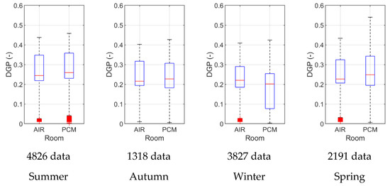 Concerning the impact of PCM glazing on visual comfort, no noticeable difference between the two rooms was observed during partly cloudy and sunny days, similar to the summer season. However, the DGP in the PCM room was slightly higher than that in the AIR room (Figure 10h). The interreflections of the daylight within the PCM in the solid-state cause high luminance, which turns into occupant discomfort due to glare. Figure 10h also shows that the DGP is below 0.25 in both rooms on cloudy days, so there was no glare. Nevertheless, during the first and last hours of the day, the daylight availability decreased in the PCM room, which meant artificial lighting was needed to provide enough indoor illuminance. Consequently, the DGP variation during the whole monitoring period was higher in the PCM room (Figure 8).