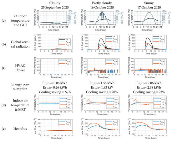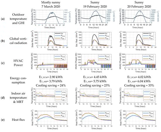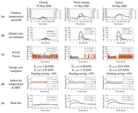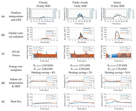 The heating energy consumption was similar in both rooms during partly cloudy and cloudy days because the PCM was solid the whole day, and the solar heat gains were negligible (Figure 12c). During sunny days, the PCM blocked the solar heat gains during the morning, increasing the heating demand in the PCM room. In contrast, solar heat gains in the AIR room help to reduce HVAC energy consumption between 10 and 13 h (Figure 12c).