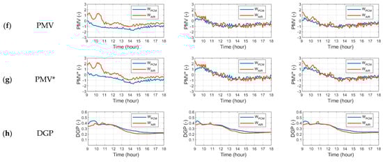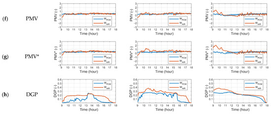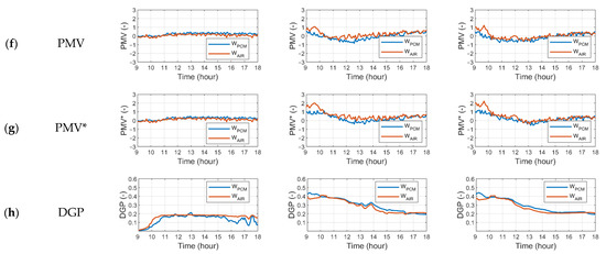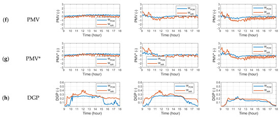 Figure 10. Results for representative days of mid-season warm. (a) Outdoor temperature and global horizontal radiation (GHI); (b) global vertical radiation; (c) HVAC power and energy consumption; (d) indoor air temperature & mean radiant temperature (MRT); (e) heat flux; (f) PMV; (g) PMV*; (h) DGP.