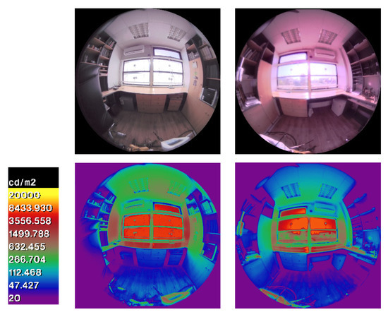 A device composed of a Raspberry Pi 3 Model B, a CMOS sensor Sony IMX219 (3.04 mm, f/2), and a miniature equisolid-angle fisheye lens was built to measure DGP. This device takes images with a resolution of 3280 × 2464 pixels. High Dynamic Range (HDR) images were built to calculate DGP by merging Low Dynamic Range (LDR) images varying the sensor exposure. Six LDR images were taken using sequential exposure bracketing of 8 µs, 3.125 ms, 12.5 ms, 0.05 s, 0.2 s, and 0.8 s. The LDR images were merged to build the HDR image using HDRgen [37] software. After merging each HDR image, luminance measurements by Konica LS-160 were used to calibrate the luminance value of the HDR images following the procedure indicated by [38]. This procedure consisted of cropping HDR images to a square encompassing the circular fisheye view, adjusting the projection of the HDR image using the distortion function, setting the pixels outside the fisheye view to black, editing the HDR image header with the projection type and real viewing angle, and validating the luminance values on a gray surface. After performing this procedure, a calibration value for each camera was found and applied to all HDR images to obtain corrected luminance values. This paper presents the results of DGP and luminance maps that were measured every 5 min.