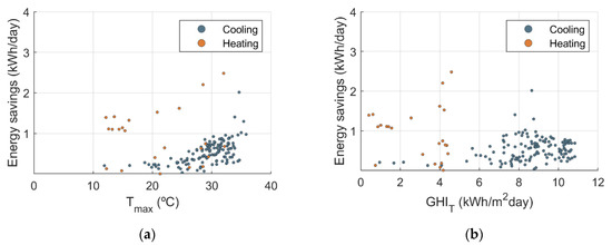 Figure 14a,b show the relation between daily energy savings, daily maximum outdoor air temperature and daily total global horizontal irradiation, respectively. These figures show increasing cooling energy savings while the maximum outdoor temperature and irradiation increase. This increment is clear in days with irradiation over 6 kWh/m2day and a maximum outdoor temperature over 25 °C. In contrast, no tendency is observed between heating energy savings and these climate variables.