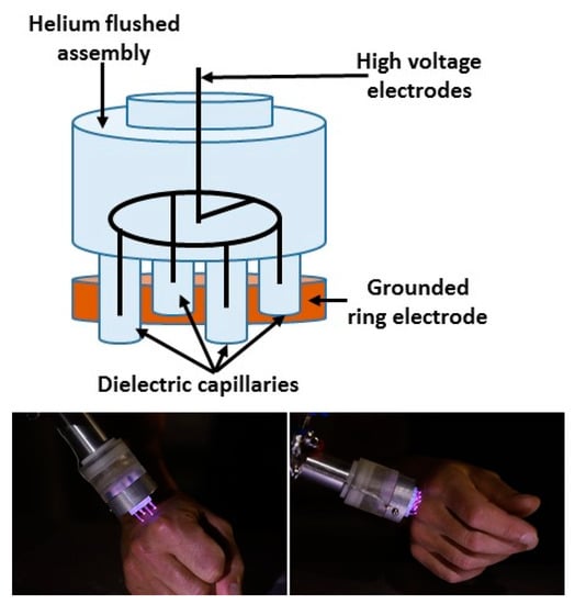 Top: schematic of the low voltage multi-jet applicator (option 3). Bottom: 4 and 9 low voltage multi-jets delivered on the author’s hand. Parameters: voltage 2.5 kV, repetition rate 20 kHz, gas flow 2 L/min.