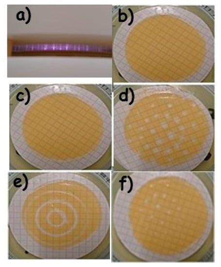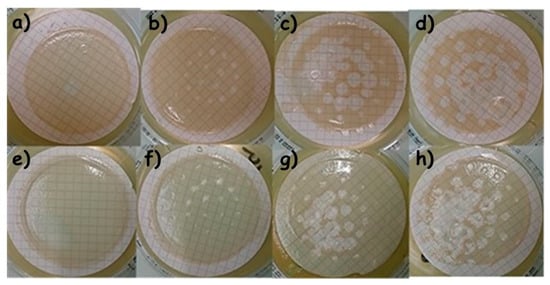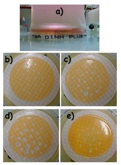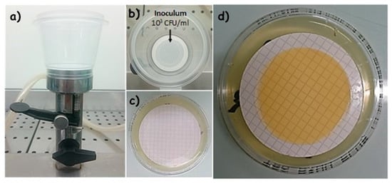 As shown in Figure 3, a membrane filtration system composed of a funnel and a vacuum valve was used to prepare samples with different bacterial strains. The bacterial inoculum solution was set in the funnel, the base of which was equipped with a membrane 47 mm in diameter and having a porosity of 0.45 µm. This membrane, set on a filter stone, acted as filter for the inoculum when the vacuum pump was switched on. In this work, an inoculum (103 CFU/mL) volume of 100 mL was filtered across the membrane. The membrane was then set on an agar disk (50 mm in diameter) prepared in a petri dish. Following a 24-h incubation period at 37 °C, a 10 cm2 bacterial lawn was produced as shown in Figure 3d.