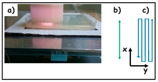 Two scanning patterns have been experienced. First was a translation pattern with back and forth linear displacements, the back and forth duration being 12 s and having an extension of 100 mm. This translation pattern was repeated respectively 5, 25 or 50 times, thus corresponding to a whole plasma treatment duration of 1, 5 and 10 min. The second pattern, zigzag-like, is shown in Figure 4c, and combined translation along the x and y axis of 100 and 2 mm, respectively. The time set to process the full pattern was one-minute long and this was repeated for 5 or 10 times, corresponding to 5 or 10-min plasma exposure durations.