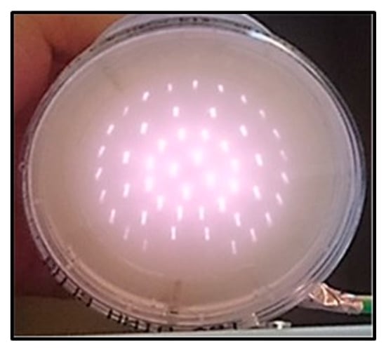 A larger surface bacterial lawn of 12 × 12 cm2 inoculated with patients’ collected resistant bacteria have also been prepared and exposed to plasma. A 100 µL volume of bacterial solution having 104 colony forming units per milliliter (CFU/mL) was spread over the surface of the agar plate. These large surface inoculated agar samples were then incubated at 37 °C for 24 h with or without preliminary plasma treatment. The plasma treatment with the multi-spot applicator was performed in a scanning protocol with the help of a programmable displacement board allowing various scanning patterns and speeds with the fixed plasma applicator and the moving agar sample as shown in Figure 4.