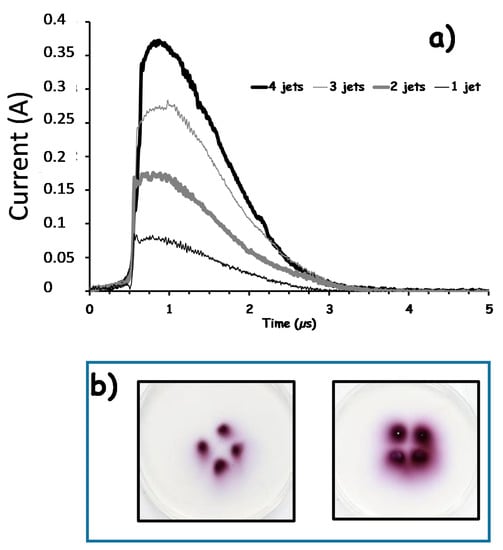 Figure 6a presents the current measurements performed with the use of a grounded metallic target set 10 mm away from the low voltage applicator delivering 4 secondary jets. By using a dielectric foil set to impede either none, one, two, and three of the secondary jets to impact the target, Figure 6b demonstrates that each one the secondary jets carry on a fourth of the whole current measured when the four jets impinge on the target.