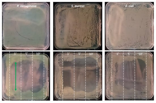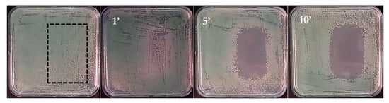 In terms of a patient’s wound plasma treatment, it is important to assess the bactericidal action of plasma jets not only on a single strain inoculum but also for a mixture of different strains, as wounds are most of the time colonized by a symbiotically living bacteria assembly. Figure 11 presents the multi-spot plasma treatment of a combination of resistant P. aeruginosa, S. aureus and E. coli inoculum spread over an agar substrate. The zigzag scanning mode was processed for 1, 5 and 10 min in one selected region of the agar plate. This scanning mode was selected to mimic the way medical doctors or nurses may treat a large wound with a plasma device.
