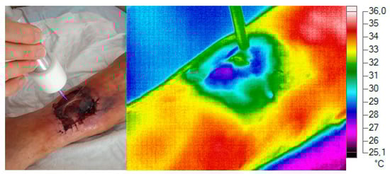 This preliminary study was performed at Orleans Regional Hospital (CHRO) in the department of Tropical and Infectious Diseases under the supervision of Dr T. Prazuck. The study was approved by the CHRO ethical committee on the base of bibliographic data published by different teams reporting clinical trials with non-thermal plasma devices and following a tolerance study performed at Institut Gustave Roussy (Villejuif, France) under the supervision of Dr L. Mir [], with the multi-jet applicator technology described in this work applied to both nude and hairy mice. It was measured that neither severe nor irreversible skin disorders were induced following minutes long multi-jet delivery in a single fraction. The tolerance study performed at CHRO included five hospitalized patients bearing superinfected wounds having diameters ranging from 3 to 15 cm. A single jet low voltage device was used to deliver plasma during one minute for each half square centimeter surface unit, as shown in Figure 12. The full time exposure of the wound treated zone, which was not always covering the whole ulcerated tissue, ranged from 15 to 30 min. The plasma device was handheld and operated either by the coauthors or the medical staff of the hospital. Each of the five patients was plasma treated either daily or each other day, reaching at the end a median five-day fraction of plasma treatment. The patients were preventively grounded by means of an antistatic bracelet so to better control their potential and the plasma treatment. Tolerance was assessed by scoring the patient feelings during and after the plasma delivery fractions. It was also systematically and carefully investigated by nurses in charge of the treatment that no necrotic, inflammatory and cutaneous stress appeared at the place where the plasma jet was applied. As reported in Figure 12, the temperature of the treated area was monitored live by means of an infrared camera (Fluke Ti480 by Fluke). The surface of the wound is in general colder due to the presence of liquid and the consequent cooling caused by evaporation. At the place where the plasma jet was applied a temporary small increase (about +3–5 °C) of the surface temperature was observed. The recorded temperature always remained below 40 °C, so any adverse effect due to excessive heating can be discarded.