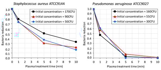 Figure 13 presents the Staphylococcus aureus ATCC9144 and Pseudomonas aeruginosa ATCC9027 colony reduction versus the plasma exposure duration. For the two bacteria, three different initial concentrations were exposed in triplicate: respectively about 170, 90 and 50 and 160, 55, 30 colonies/membrane were used for Staphylococcus aureus and Pseudomonas aeruginosa respectively. These colony concentrations were selected as being representative of typical infection levels in the hospital context following the baseline decontamination protocols using disinfectants. In Figure 13, the colony reduction was plotted after applying a normalization for three experiments (realized in triplicate) for each of the bacterial strains. It is worth noting that whatever the initial colony concentration, the same trends are measured, leading to an efficient reduction after a 10-min-long exposure for both bacterial strains.