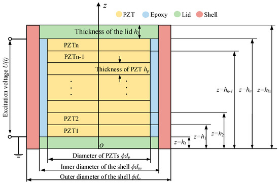 where σpzti and εpzti are the stress and strain of the ith PZT disc in the z-axis direction, respectively; σei and εei are the stress and strain of the epoxy in the clearance between the protective shell and the PZT disc in the z-axis direction, respectively; σsi and εsi are the stress and strain of the protective shell in the z-axis direction, respectively; , Ei and Di are the electric potential, electric field, and electric displacement of the PZT disc, respectively; C33e, C33s, and C33pzt are the elastic moduli of the epoxy, the protective shell, and the PZT disc, respectively; , , where d33 and are the piezoelectric coefficient and permittivity coefficient, respectively.