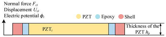 Moreover, the kinematic equation at the ith composite layer of the protective shell, the ith PZT disc, and the epoxy, as shown in Figure 3, can be expressed as