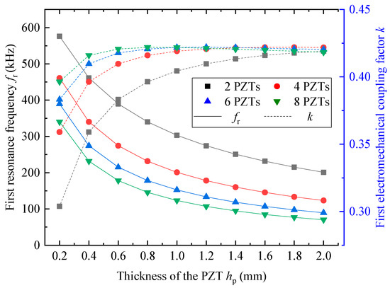 The influence of the thickness of the PZT hp on the first resonance frequency and electromechanical factor.
