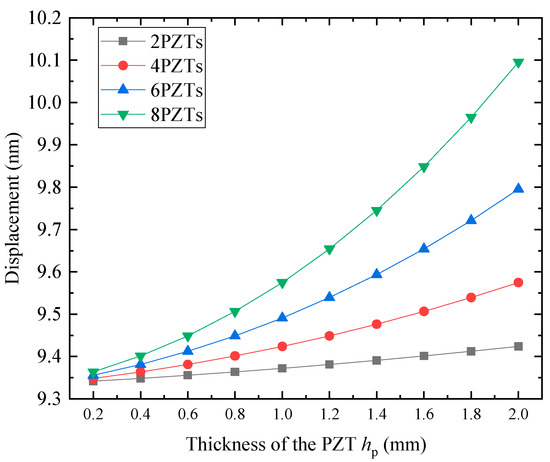 Figure 7 describes the influence of the thickness of the PZT disc on the first resonance frequency and the first electromechanical coupling factor, and Figure 8 illustrates the relationship between the displacement at z = hl1 and the thickness of the PZT hp at the frequency f = 20 kHz. It is clear from Figure 7 that the first resonance frequency decreases from 576.31 kHz to 70.34 kHz as the thickness of the PZT increases from 0.2 mm to 2 mm. Figure 7 also shows that when the thickness is 0.6 mm, the first electromechanical coupling factor saturates regardless of the number of the PZT disc. Figure 8 indicates that the displacement of SAPS with the number of PZT discs 2, 4, 6, and 8 at z = hl1 increases 0.879%, 2.42%, 4.70%, and 7.82% as the thickness increases from 0.2 mm to 2 mm.