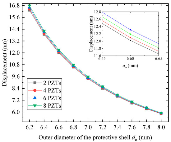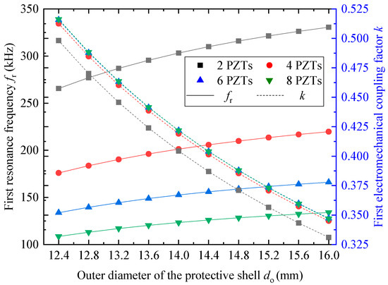 Figure 9 shows the influence of the outer diameter do of the protective shell on the first resonance frequency and the first electromechanical factor, and Figure 10 illustrates the relationship between the displacement at z = hl1 and the outer diameter do of the protective shell at the frequency f = 20 kHz. Figure 9 demonstrates that the first resonance frequency increases 23.4–23.86% as the outer diameter of the protective shell increases from 12.4 mm to 16 mm, while the first electromechanical coupling factor decreases 32.66–33.5%. Figure 10 indicates that the displacement decreases 64.41–64.76% as the outer diameter of the protective shell increases from 12.4 mm to 16 mm.