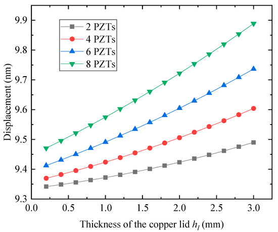 Figure 11 shows the influence of the thickness hl of the two copper lids on the first resonance frequency and the first electromechanical factor, and Figure 12 illustrates the relationship between the displacement at z = hl1 and the thickness hl of the copper lid at the frequency f = 20 kHz. Figure 11 indicates that the first resonance frequency decreases 44.21–68.31% as the thickness of the copper lid increases from 0.2 mm to 3 mm, and the coupling factor firstly increases to the peak value and then decreases, and the change of the coupling factor is 0.7–17.8%. Figure 12 reveals that the displacement at z = hl1 with the frequency f = 20 kHz increases 1.59–4.41% as the thickness of the copper lid increases.