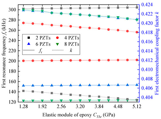 The influence of the elastic modulus C33e of epoxy on the first resonance frequency and electromechanical factor.