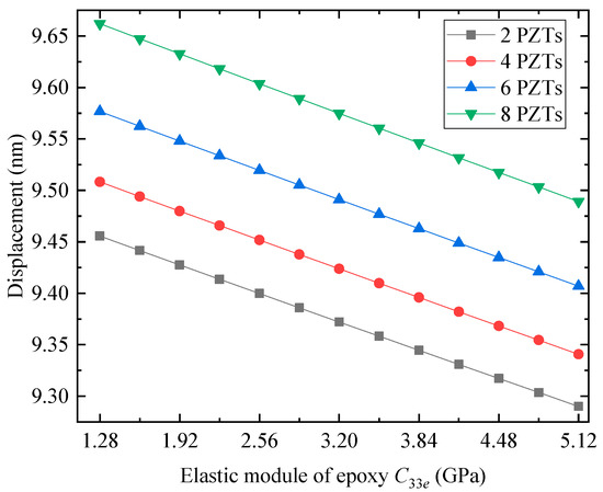 Figure 13 shows the influence of the elastic modulus C33e of the epoxy between the clearance between the protective shell and the PZT discs on the first resonance frequency and electromechanical coupling factor, and Figure 14 plots the displacement at z = hl1 versus the elastic modulus C33e of epoxy with the frequency f = 20 kHz. Figure 13 indicates that the first resonance frequency just changes 0.79–0.90% as the elastic modulus increases from 1.28 GPa to 5.12 GPa. Figure 14 also shows that the first electromechanical coupling factor just decreases 0.46–0.52% as the elastic modulus C33e changes from 1.28 GPa to 5.12 GPa. Figure 14 reveals that the displacement at z = hl1 decreases 1.75–1.79% when the modulus C33e changes from 1.28 GPa to 5.12 GPa.