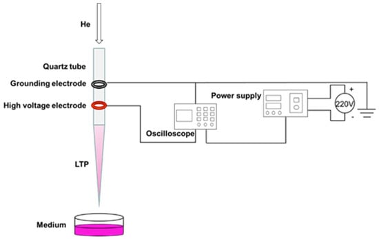 After the cell culture medium is treated with low temperature plasma (LTP) jet (atmospheric pressure plasma jet, APPJ) [] for a period of time, the ions, electrons, neutral particles (atoms, gas molecules, etc.), ultraviolet rays, RONS and other substances react with the culture medium [] and produce plasma-activated medium (PAM). PAM can increase the level of oxidative stress in cells and thus promote or inhibit the proliferation of cells. Related studies have shown that short-term PAM treatment can promote the proliferation of fibroblasts [], induce osteoblast differentiation [], inhibit over 20 kinds of cancer cells cultured in vitro [], including melanoma cells [], prostate cancer cells [], glioma cells [], lymphoma cells [], and liver cancer cells []. The main mechanisms of action include inducing apoptosis and necrosis of tumor cells, inhibiting proliferation signaling pathway, damaging DNA structure, and affecting migration and adhesion of tumor cells []. Studies have also shown that under the same treatment mode and time, when LTP simultaneously treats normal cells and tumor cells, it inhibits the activity of tumor cells, but significantly reduces the invasion, metastasis and adhesion of tumor cells, and has no obvious damage to normal cells [,]. What’s more, PAM can be kept stable for several days under low temperature (−80 °C), dark and sealed storage, and the concentration of active ingredients remains unchanged [].
