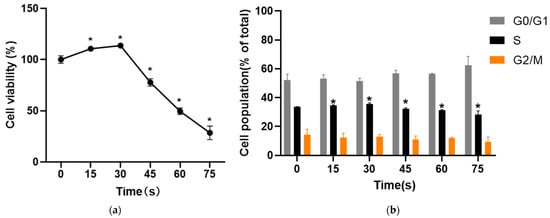 (a) Results of MTT. The cell viability increased significantly at 15 s and 30 s and the cell viability decreased at 45 s, 60 s and 75 s. * compared with control group p < 0.05. (b) Results of cell cycle. The proportion of cells in S phase in 15 s and 30 s-PAM groups was increased while the proportion of cells in S phase in 45 s, 60 s and 75 s-PAM groups was significantly decreased. * compared with control group p < 0.05.