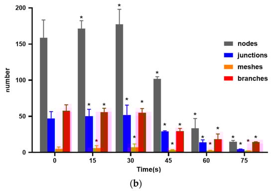 As shown in Figure 3, compared with the control group, the 15 s and 30 s-PAM groups had significantly increased number of nodes, junctions, mesh number and vascular branches, while the 45 s, 60 s and 75 s-PAM groups had significantly decreased number of nodes, junctions, mesh number and vascular branches (p < 0.05) (Figure 3a,b).