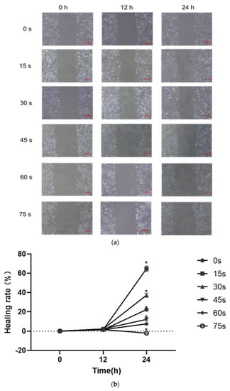 The results of scratch healing test were shown in Figure 4a,b. After 24 h of culture by PAM containing 1% serum, the scratch area in the control group was reduced by 22.38 ± 1.55%, the scratch healing rate was increased compared with that at 0 h, and the difference was statistically significant (p < 0.05). The scratch area in the 15 s, 30 s, 45 s and 60 s-PAM groups decreased by 64.72 ± 2.83%, 37.25 ± 2.1%, 12.23 ± 1.72% and 7.56 ± 1.05%, respectively, the scratch healing rate increased compared with that at 0 h, and the difference was statistically significant (p < 0.05). After 24 h of culture, the cell scratch healing ability of 75 s-PAM group decreased to −2.11 ± 0.22%, compared with that at 0 h. The number of cells was few, the cell connection was loose, and the convergence was significantly decreased (p < 0.05).