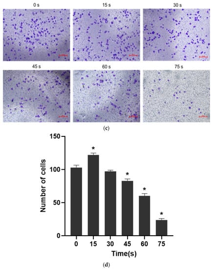 The results of single-layer penetration experiment were shown in Figure 4c,d: the number of cells passing through the subcompartment in the 15 s-PAM group was 122 ± 2.68, which was significantly increased compared with that in the control group (103 ± 3.54). The number of cells passing through the subcompartment in the 30 s-PAM group was 97 ± 1.93, which had no significant difference compared with that in the control group. In the 45 s, 60 s and 75 s-PAM groups, the number of cells passing through the subcompartment was 83 ± 2.83, 60 ± 3.75 and 24 ± 2.10, respectively, which was significantly reduced compared with that in the control group, and the difference was statistically significant (p < 0.05).