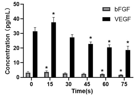 The secretion of the VEGF and bFGF was detected with ELISA, and the results were shown in Figure 6. The concentrations of VEGF and bFGF secreted by HUVECs in the control group (0 s) were 31.53 ± 2.56 pg/mL and 3.23 ± 0.85 pg/mL. The concentrations of VEGF and bFGF in 15 s-PAM group were 37.61 ± 3.41 pg/mL and 3.63 ± 0.90 pg/mL, respectively, which were significantly increased compared with those in the control group (p < 0.05). In 30 s-PAM group, the concentrations of VEGF and bFGF were 27.38 ± 1.80 pg/mL and 2.68 ± 0.50 pg/mL, with no significant changes (p > 0.05). The concentrations of VEGF and bFGF in 45 s-PAM group were significantly decreased, which were 22.77 ± 1.47 pg/mL and 2.43 ± 0.42 pg/mL, respectively, and there were no significant changes compared with those in the 0 s group. In 60 s and 75 s-PAM groups, VEGF secretion was significantly decreased, which was 20.46 ± 1.82 pg/mL and 18.71 ± 2.61 pg/mL, respectively, and bFGF secretion was also significantly decreased, which was 2.15 ± 0.34 pg/mL, and 1.66 ± 0.24 pg/mL (p < 0.05).