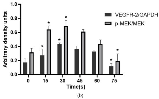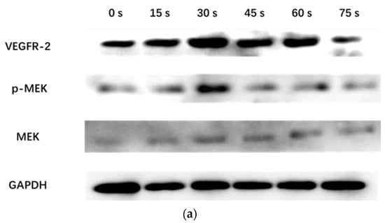 WB results showed that the VEGFR-2/GAPDH ratio in the control group, 15 s, 30 s, 45 s, 60 s and 75 s-PAM groups was 0.17 ± 0.05, 0.27 ± 0.09, 0.43 ± 0.02, 0.36 ± 0.04, 0.32 ± 0.02 and 0.11 ± 0.04, respectively. The p-MEK/MEK ratio was 0.31 ± 0.06, 0.64 ± 0.05, 0.69 ± 0.08, 0.61 ± 0.03, 0.43 ± 0.06 and 0.19 ± 0.10, respectively. The relative expressions of VEGFR-2 and P-MEK were significantly increased in 15 s and 30 s-PAM groups (p < 0.05), significantly decreased in 75 s-PAM group (p < 0.05), but remained unchanged in 45 s and 60 s-PAM groups (p > 0.05) (Figure 7a,b).