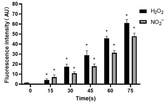 The concentration of NO2− in control group was (0.25 ± 0.10) μM, and increased to 7.02 ± 2.35, 10.91 ± 1.47, 17.89 ± 2.31, 31.38 ± 2.26 and 47.88 ± 3.02 μM when the treatment time prolonged. The results showed that the concentrations of H2O2 and NO2− increased gradually with the extension of treatment time, and the results were significantly different (p < 0.05) (Figure 8).