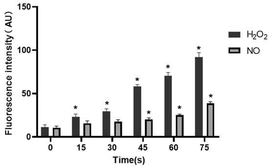 Concentrations of H2O2 and NO in HUVECs, * compared with control group (0 s) p < 0.05.